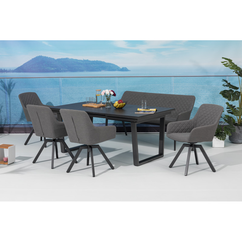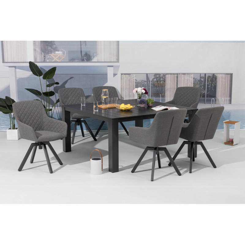 Tato luxusní souprava je vhodná pro každého, kdo hledá elegantní nábytek s mimořádnou odolností vůči nepřízni počasí. Sestava se skládá ze 6 otočných křesel a velkého hliníkového rozkládacího stolu.