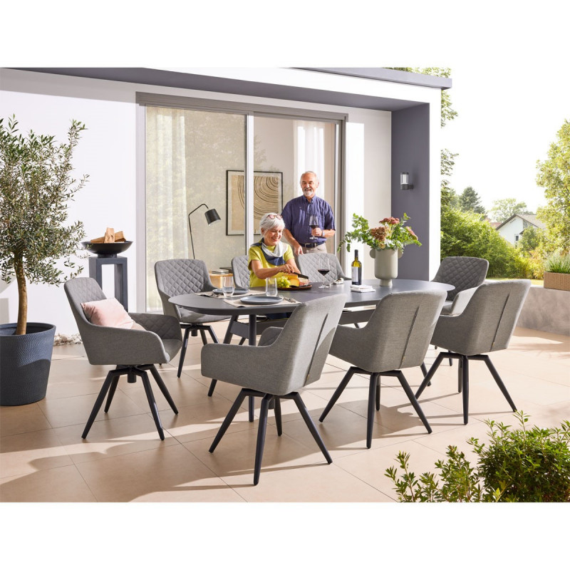 Tato luxusní souprava je vhodná pro každého, kdo hledá elegantní nábytek s mimořádnou odolností vůči nepřízni počasí. Sestava se skládá z 8 otočných křesel a velkého hliníkového rozkládacího stolu.